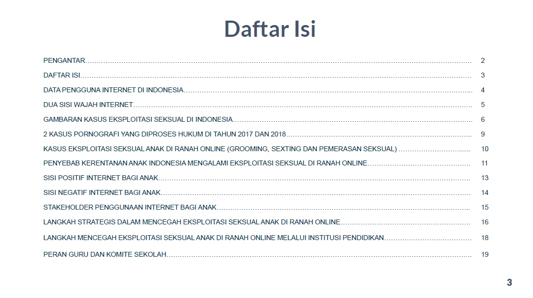 Modul ini digunakan untuk melatih para pendidik (guru) dan para pengambil kebijakan di sekolah, untuk memahami secara mendalam peta penggunaan internet di Indonesia, dengan menampilkan fakta-fakta yang terjadi dalam rentan 5 tahun terakhir (2013-2018).